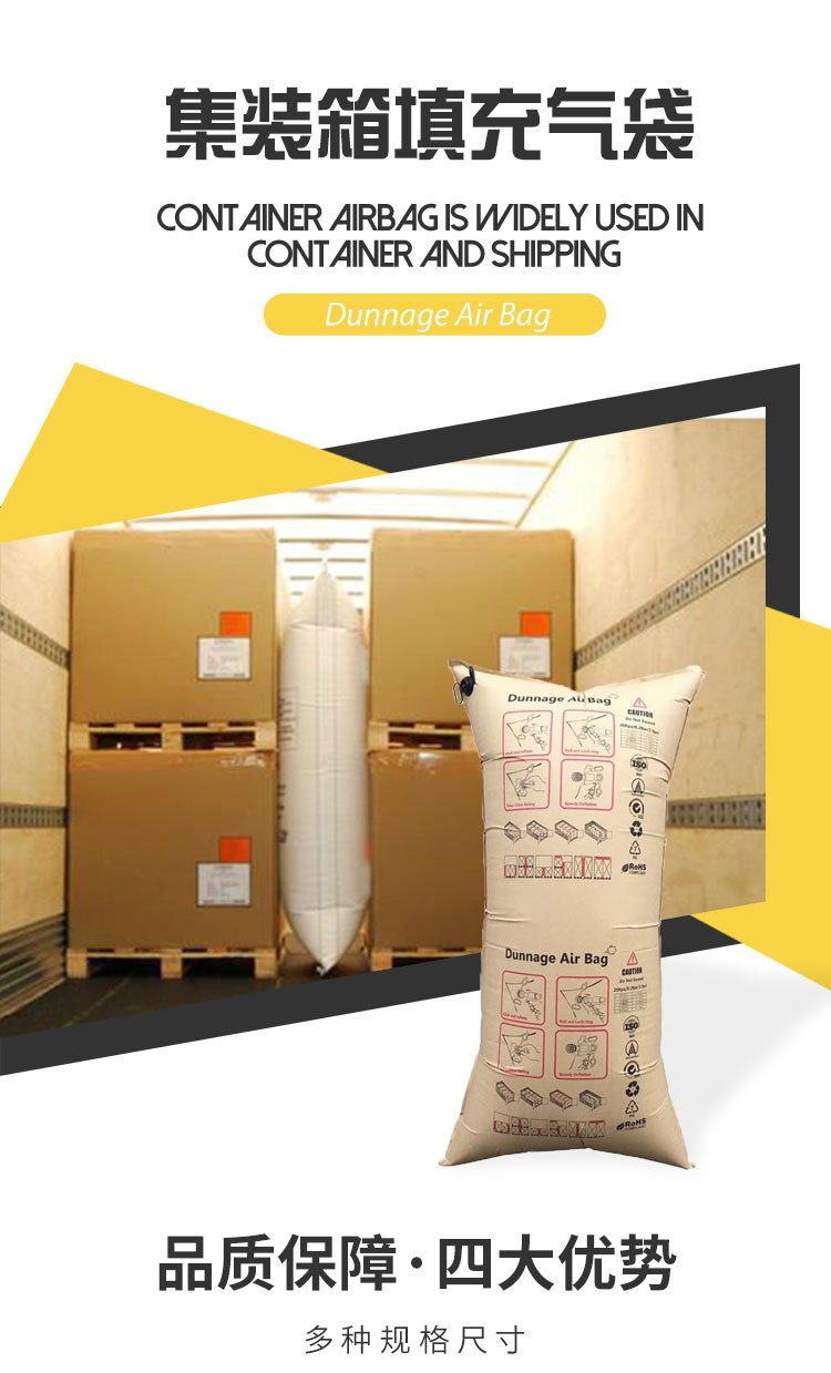 集裝箱填充氣袋被廣泛地應用在集裝箱、海運;拖車、火車等各種運輸方式中,它的作用是填充貨物之間的空隙能夠起到緩沖作用,吸取震動從而保護產品不因碰撞受到損壞。能有效地保護運輸途中的貨物,避免相互碰撞,起到緩沖、防倒塌等作用,特別適用于托盤化、整板、成批運輸物流系統(tǒng)托盤化和集裝箱化的貨物倒塌等問題。對于削減物流成本、提高裝卸速度,裝載效率等,有很大的效應.更是貨物運輸中原木材或發(fā)泡膠的新型環(huán)保替代產品。
